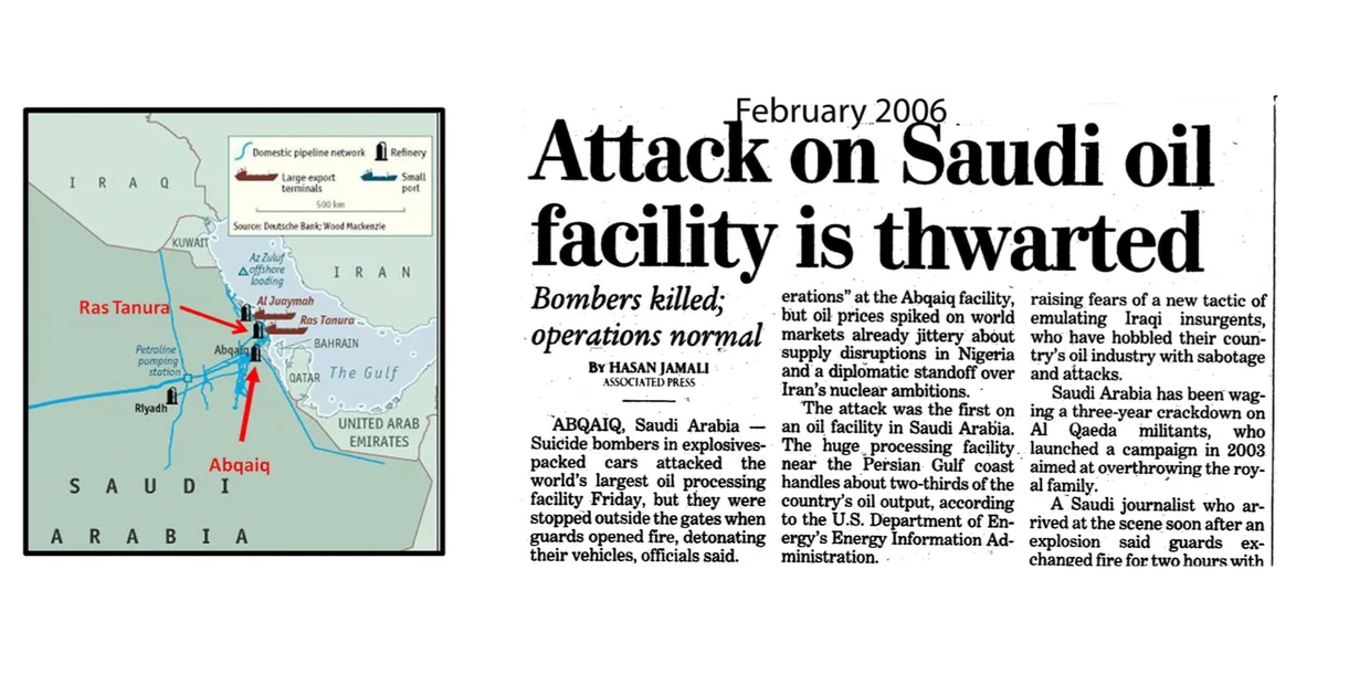 Abqaiq was actually attacked by Al Queda in February 2006 and again by unknown entities with drones in September 2019. We were lucky that the attack occurred at Abqaiq and not the oil pipelines at Ras Tanura themselves.