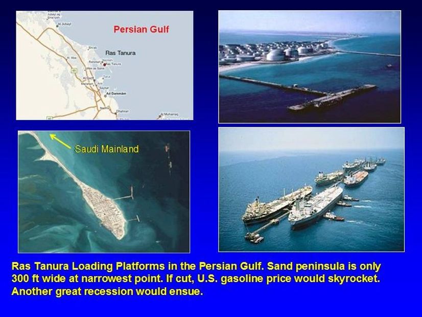 Sea Island Platform #4, the largest offshore loading platform in the world, is located at Ras Tanura. If either or both of these facilities were damaged for any length of time, it would severely damage the American economy. $6-7/gallon gasoline as California saw recently will end up looking like the price of the good old days.