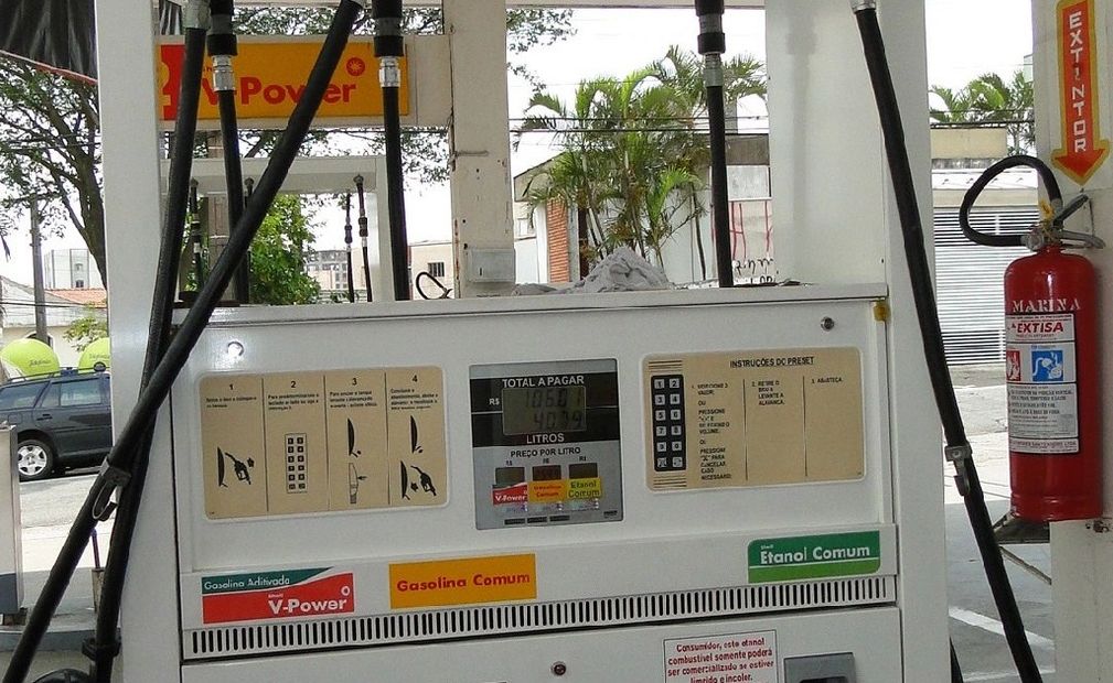 A Shell station in Sao Paulo. Brazil showing 2 grades of gasoline and one of E100.